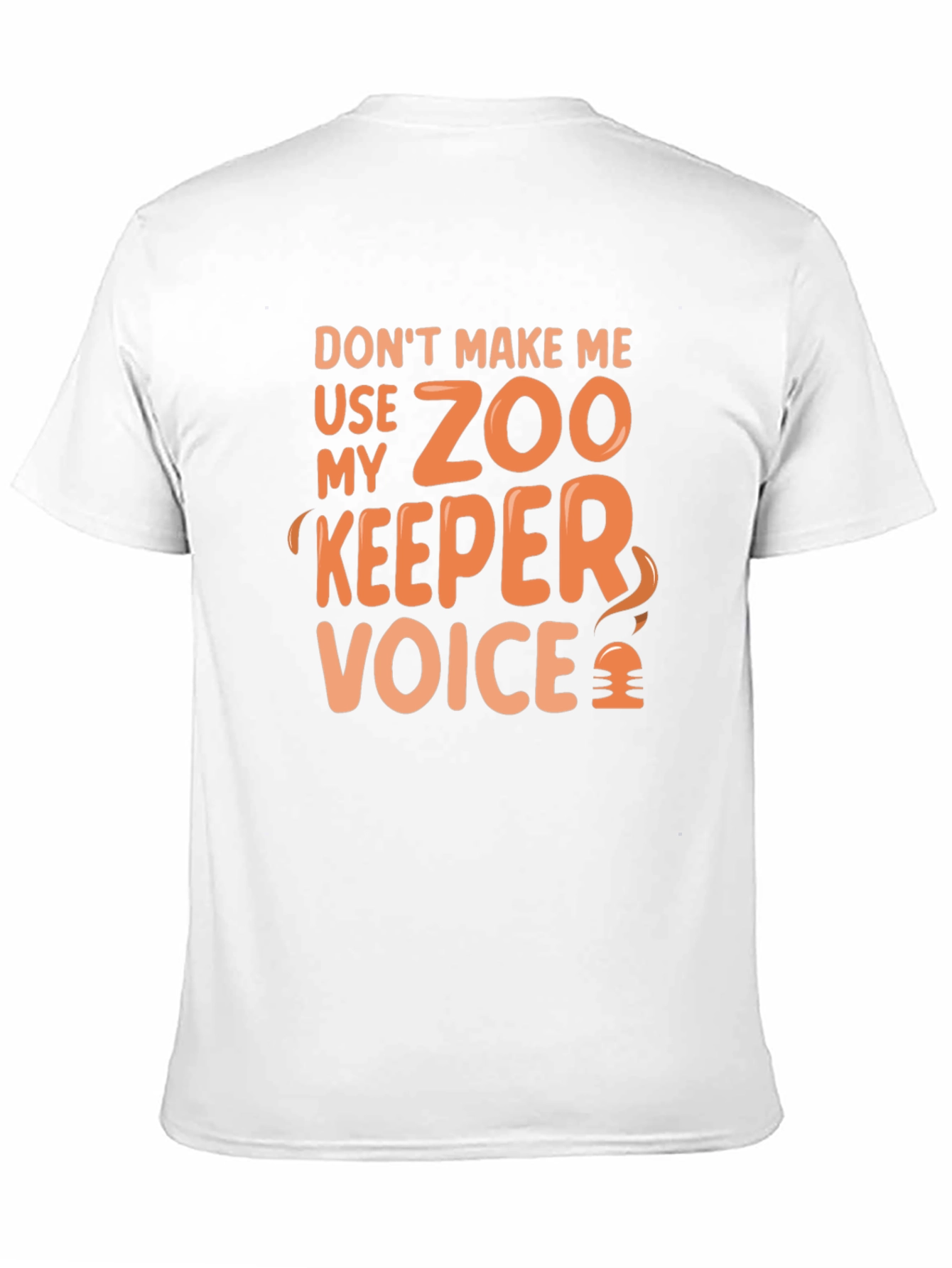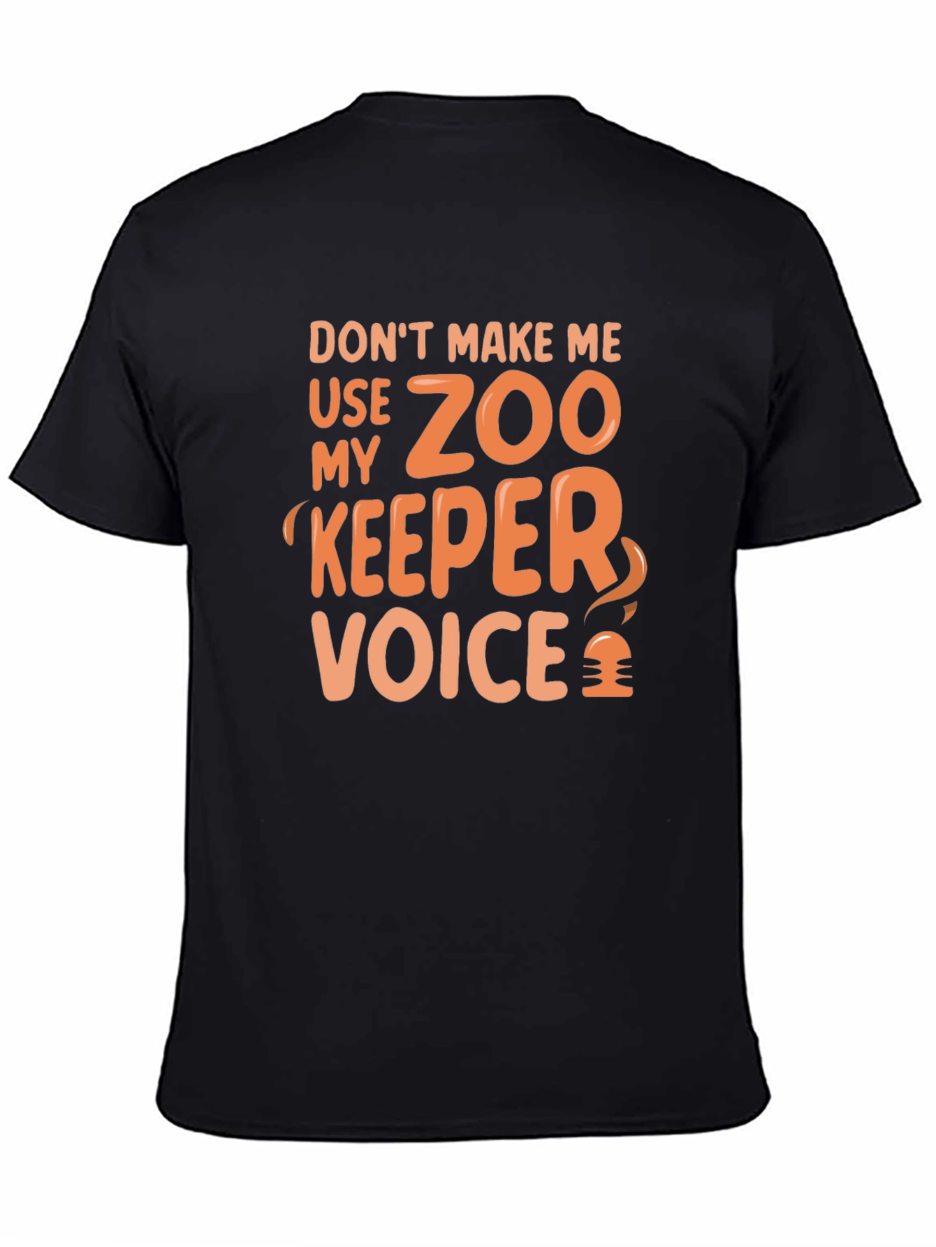 Luce esta divertida camiseta negra con un mensaje llamativo: "Don't make me use my ZOO KEEPER VOICE" (No me hagas usar mi voz de guardián del zoo), impreso en color naranja. Perfecta para los amantes de los animales, los cuidadores de zoológicos o cualquier persona con un sentido del humor único. Su diseño casual la hace ideal para usarla en el día a día, en eventos informales o como una forma original de expresar tu personalidad. El material parece ser de algodón, ofreciendo comodidad y frescura. ¡Atrévete a destacar con esta prenda original y divertida!