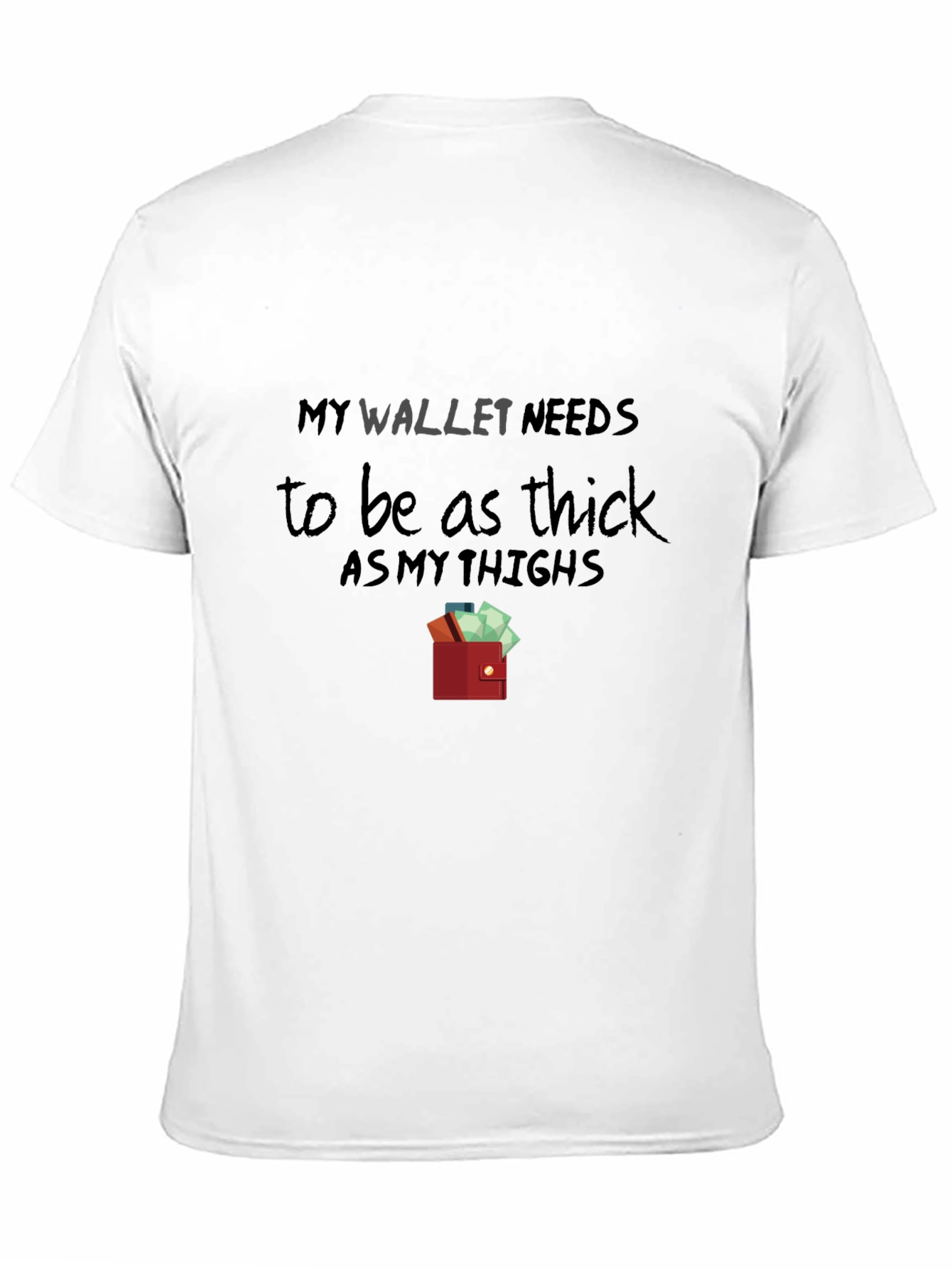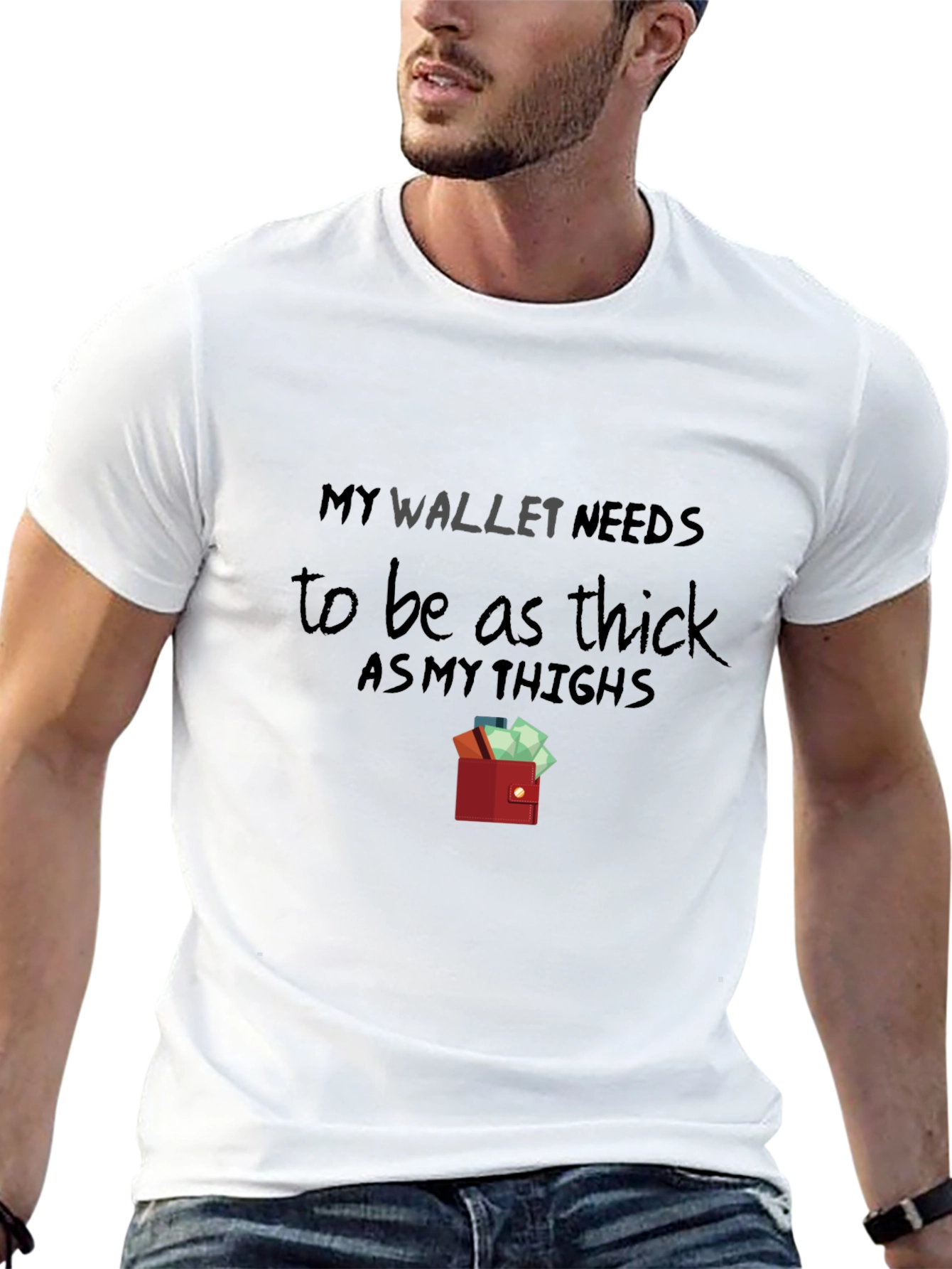 Muestra tu sentido del humor con esta camiseta negra de manga corta. Presenta un diseño divertido con la frase "My wallet needs to be as thick as my thighs" (Mi billetera necesita ser tan gruesa como mis muslos) acompañada de un icono de una billetera llena de dinero. Perfecta para aquellos que desean expresar su amor por el dinero de una manera original y con estilo. Ideal para uso casual, reuniones con amigos o para darle un toque divertido a tu outfit diario. Fabricada con materiales cómodos y duraderos. ¡Atrévete a lucir diferente!