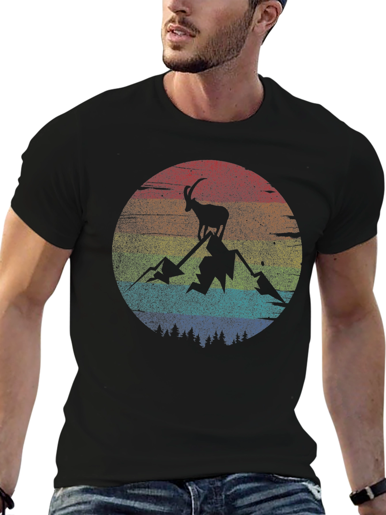 Luce un estilo único con esta camiseta negra de manga corta. El diseño presenta una cabra montañera silueteada en un círculo con franjas de colores estilo retro. Perfecta para los amantes de la naturaleza y la aventura, esta camiseta añade un toque original a tu vestuario casual. Ideal para usarla en actividades al aire libre, reuniones informales o simplemente para expresar tu pasión por las montañas. Su diseño llamativo te hará destacar, mientras que su comodidad te permitirá disfrutar de cada momento. ¡Atrévete a llevar la naturaleza contigo!