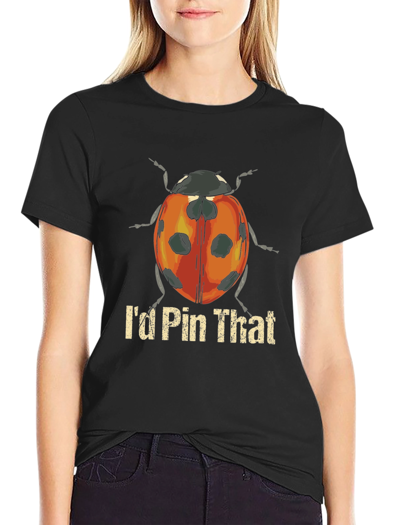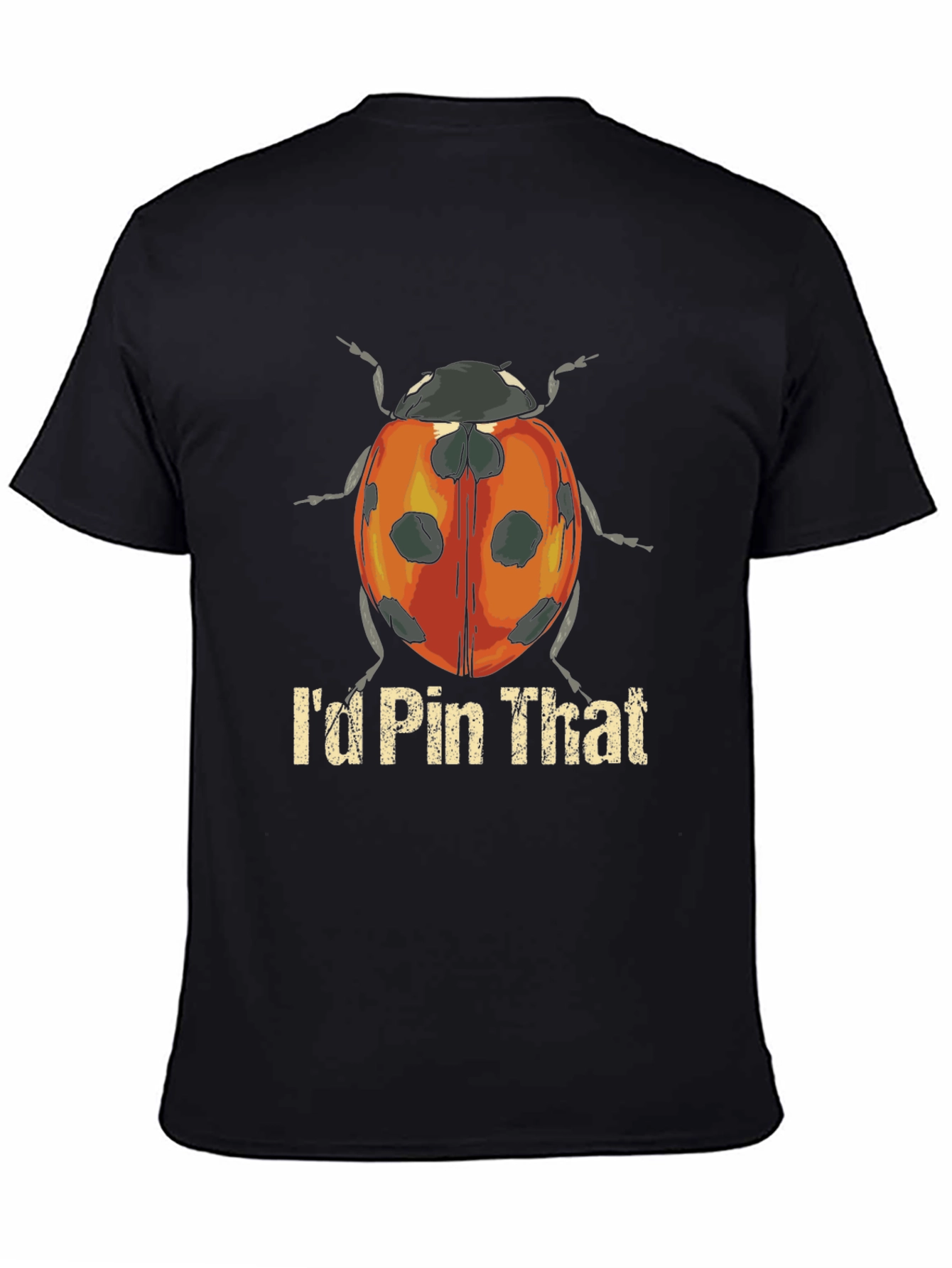 Esta camiseta negra de manga corta presenta un diseño llamativo de una mariquita estilizada en el centro. La mariquita, con un cuerpo rojo anaranjado y puntos negros, está acompañada del texto "I'd Pin That" en una fuente llamativa de color dorado. Fabricada con un material suave y cómodo, esta camiseta es perfecta para el uso diario. El diseño único la convierte en una excelente opción para aquellos que buscan expresar su individualidad y sentido del humor. Ideal para combinar con jeans o pantalones casuales, esta camiseta añadirá un toque divertido a cualquier atuendo informal. Perfecta para amantes de los insectos y la naturaleza.