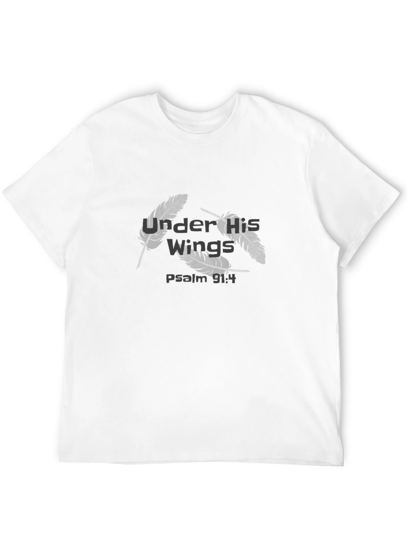 Esta camiseta negra de manga corta presenta un diseño inspirador y significativo. En el centro, se visualizan cuatro plumas estilizadas en un tono grisáceo, dispuestas en un patrón circular. Acompañando a las plumas, se encuentra el texto "Under His Wings", evocando una sensación de protección y refugio. Debajo, la referencia bíblica "psalm 91:4" completa el diseño, añadiendo una dimensión espiritual a la prenda. Confeccionada en un tejido suave y cómodo, esta camiseta es perfecta para expresar tu fe de una manera sutil y elegante. Ideal para usar en el día a día, en reuniones religiosas o como un regalo especial para alguien que aprecie la fe y el estilo.