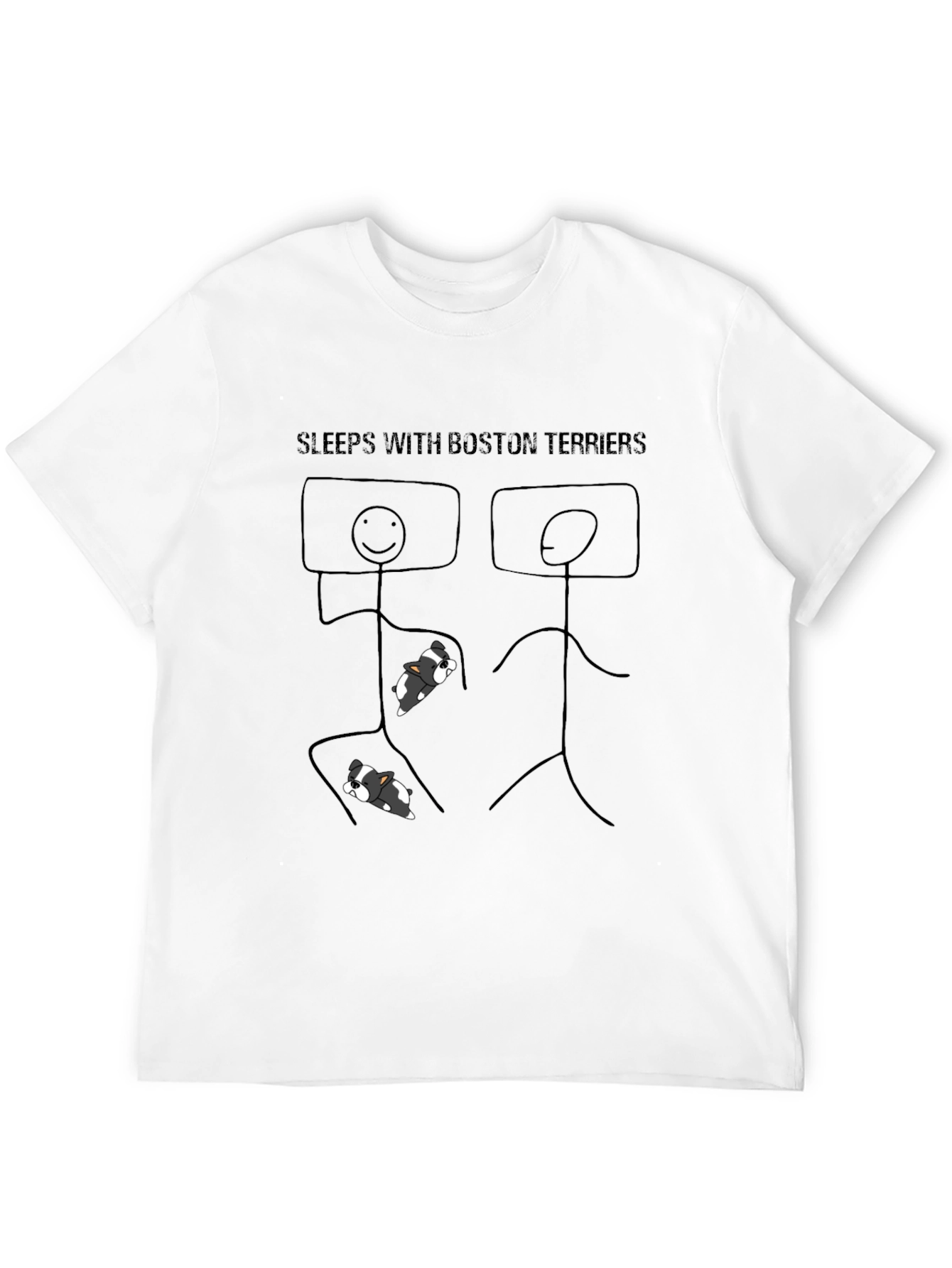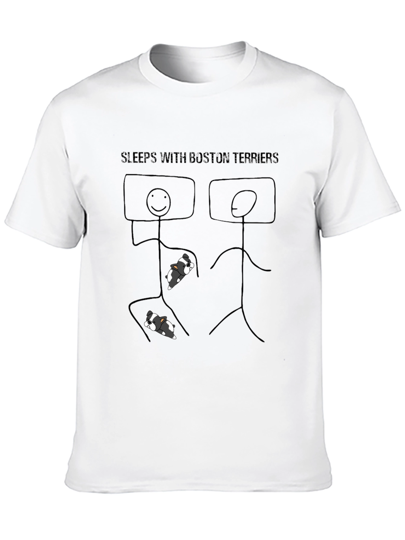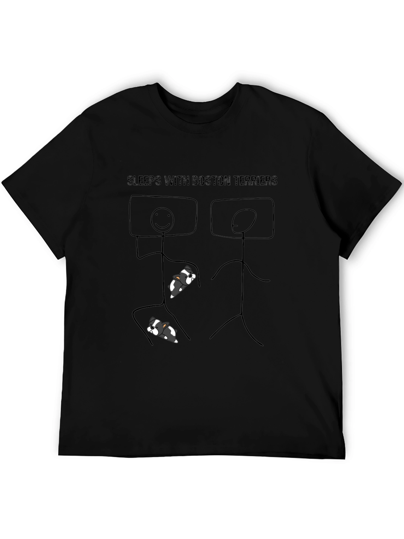 Luce esta original camiseta negra de manga corta con un diseño divertido y único. Muestra un texto que dice "SLEEPS WITH BOSTON TERRIERS" (Duermo Con Boston Terriers), acompañado de ilustraciones de figuras de palo durmiendo en almohadas, con adorables perros Boston Terrier acurrucados. Fabricada en un material suave y cómodo, esta camiseta es perfecta para los amantes de los perros y aquellos con sentido del humor. Ideal para uso casual, salidas informales o simplemente para relajarte en casa con tus amigos caninos. ¡Un regalo perfecto para cualquier dueño de Boston Terrier!